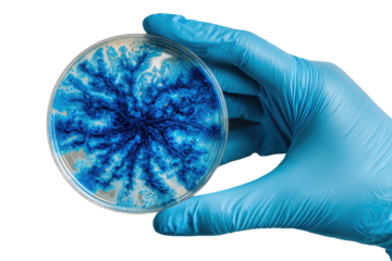 Gloved hand holds petri dish with blue dendritic growth pattern inside