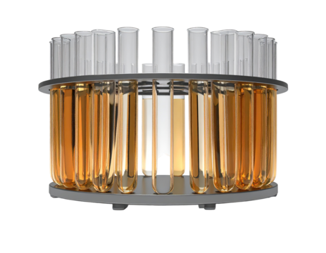 Circular metal rack holding numerous test tubes filled with amber liquid