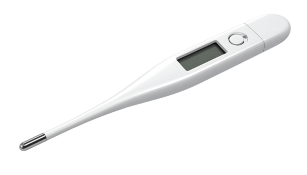 Digital thermometer with LCD display and power button, isolated on a transparent background