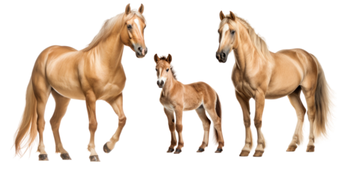 Group of cream horses: mare, stallion and foal, animal family isolated on transparent background. PNG clip art elements.