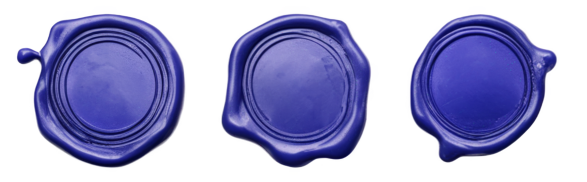 Three abstract, blue, wax seals with unique splatter details isolate on transparent background, cutout, png