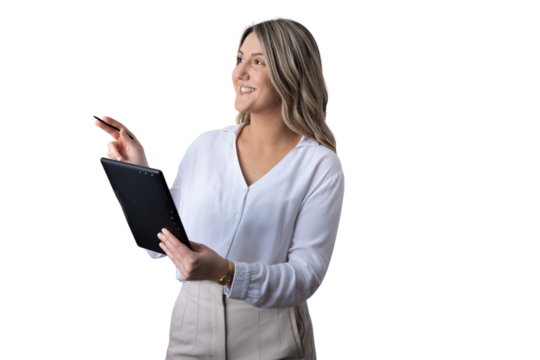 Businesswoman holding clipboard pointing presenting information transparent background