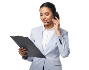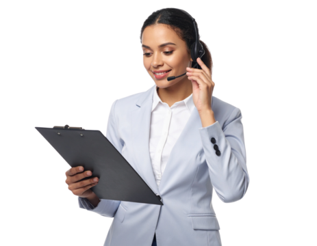 Technical support representative checking system data on clipboard while speaking through headset, isolated on a transparent background, PNG