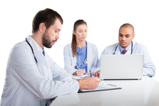 Two happy doctors in scrubs with stethoscope and clipboard transparent