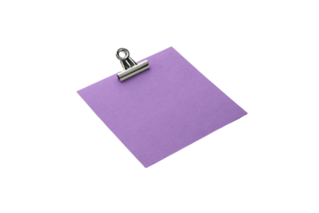 A purple note clipped by a sleek metal clip, ideal for displaying reminders or labels, isolated on a transparent background