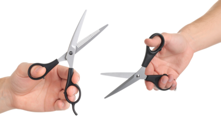 hand holding hair scissors in black color isolated on white background