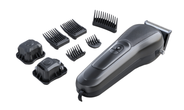Dark gray electric hair clipper with assorted attachments