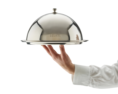 Stainless steel cloche raised over an empty plate, isolated on transparent background