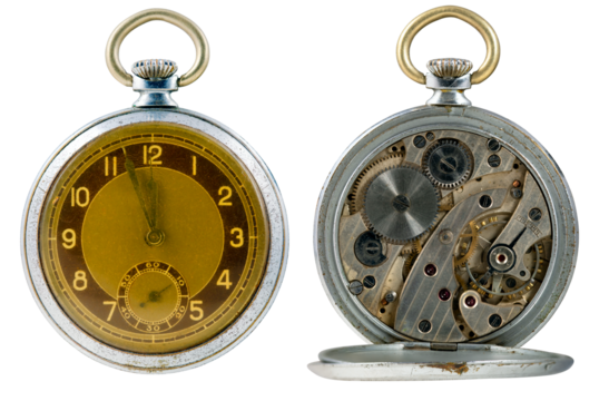 Disassembled clockwork mechanism - various part of clockwork mechanism on transparent background