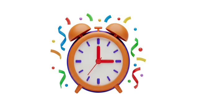 3D Alarm clock with confetti on transparent background