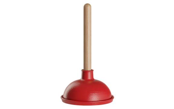 Isolated 3d render of a classic red plunger with wooden handle on a white background