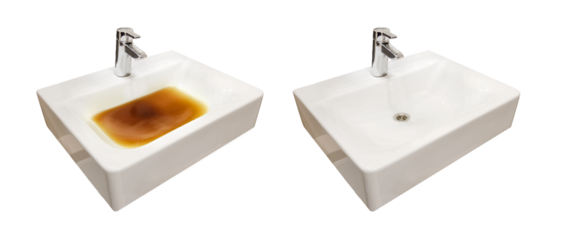 Blockage in the sink before and after the problem is resolved, isolated on a white background. Clog problems in the bathroom and toilet
