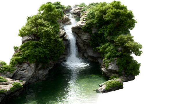 A small, secluded waterfall hidden deep within a lush, green gorge, its waters falling into a clear, inviting pool, isolated on a Transparent background