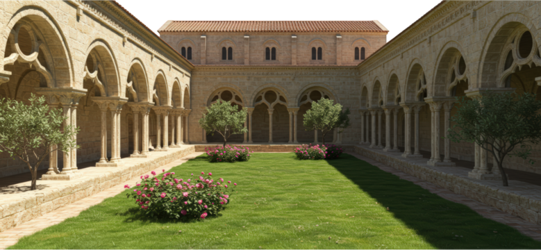 Serene Medieval Cloister Garden Stone Arches Lush Greenery Tranquil Courtyard