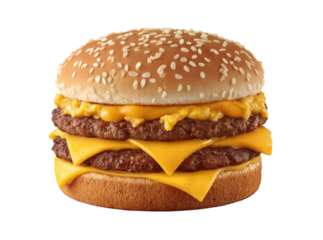 Delicious double cheeseburger with sesame seed bun, Isolated On White, Transparent Background, Png Cut Out