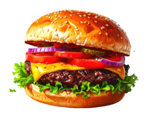 Classic cheeseburger showcasing a juicy beef patty, fresh vegetables, cheese, and a sesame bun, ready for placement