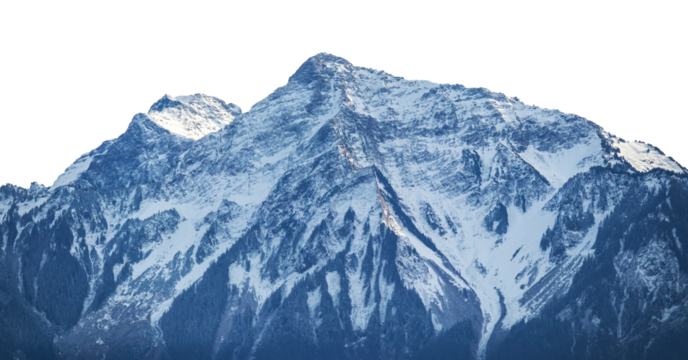 Mountain winter landscape. Mountain covered by ice and snow isolated on transparent background. Winter mountain scenery at close distance. Mountain range at high elevation. PNG transparent image.