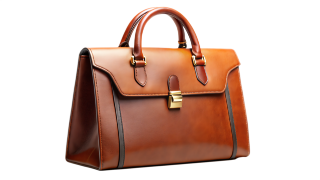 Vintage brown leather handbag with frame closure and top handle, classic fashion accessory, transparent background