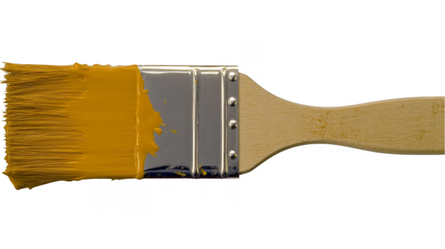 Close up view of a paint brush with white bristles on transparent background