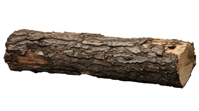 Close-up of rough tree bark texture, isolated timber log with natural surface and wood cross-section on white background.