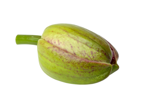 Close-up of a closed flower bud with green and purple mottled petals, isolated