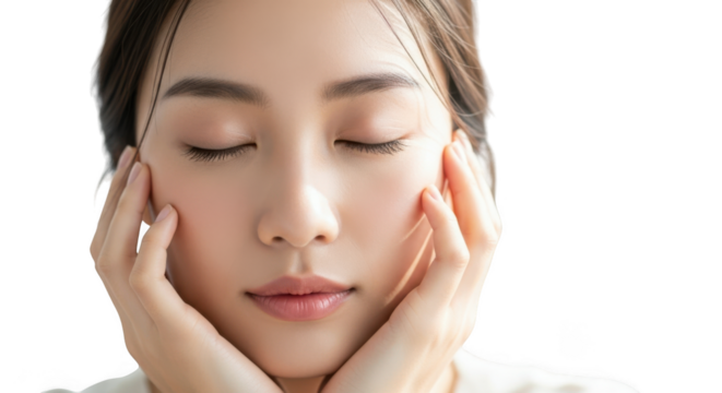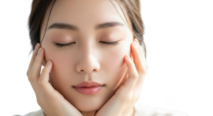 Smiling woman with eyes closed and fresh facial treatment isolated on transparent background