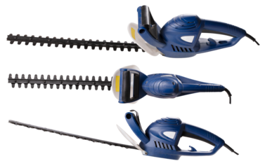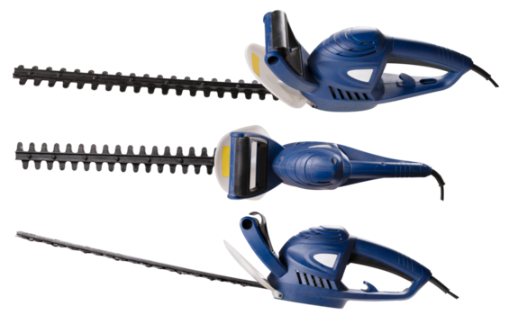 Close-up of a worn-out red chainsaw with a long blade, isolated on white background. Perfect for tools and equipment, forestry, and danger themes.