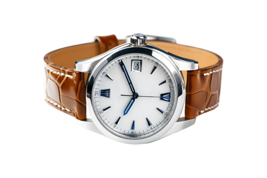 Luxury wristwatch with brown leather strap and white dial isolated on transparent background
