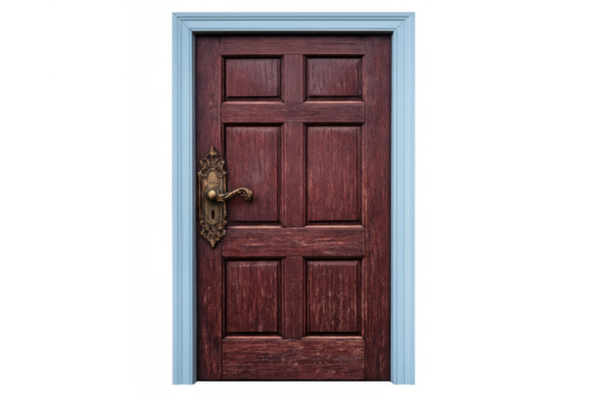 Wooden door with ornate brass handle in a light blue frame providing entrance and exit with transparent background