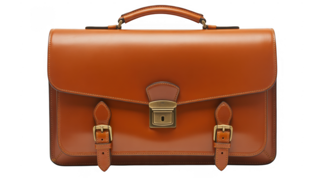Classic brown leather briefcase with brass buckle and strap closure isolated on a transparent background