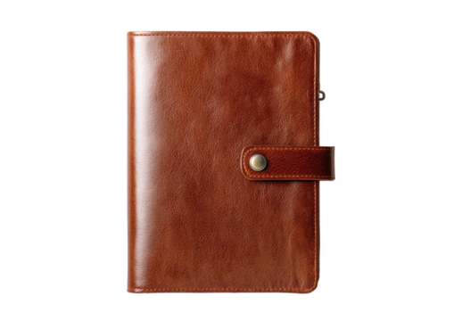 A closed, light brown leather planner.  Zippered pocket, snap closure