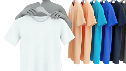 Assortment of T-shirts in various colors on hangers