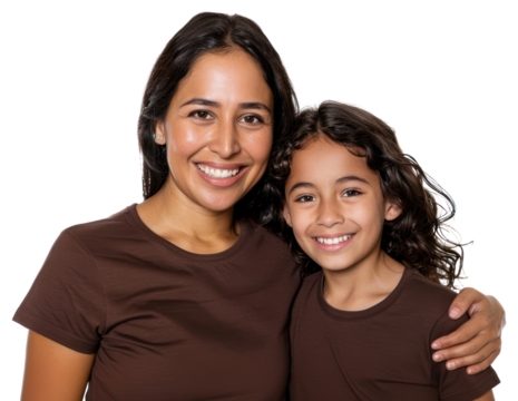 Happy family portrait with transparent background - parents and three children wearing coordinated knitwear in burgundy, beige and grey tones showing genuine smiles and warmth in professional studio p