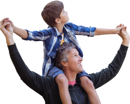 Cheerful family posing with parents giving piggyback rides on transparent background