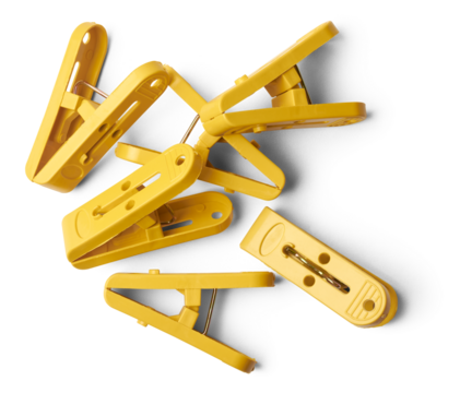 pile of yellow clips, plastic paper or laundry clips, clothespin or clothes pegs isolated on white background taken straight from above