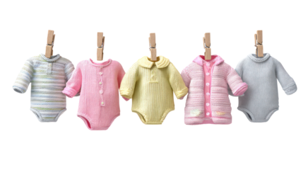 Five knitted baby onesies hanging on clothespins isolated on transparent background