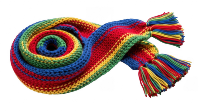 Vibrant Knitted Scarf: A brightly colored knitted scarf, boasting a spectrum of hues and textures, is artfully arranged. This unique accessory is a cheerful accent for cool weather.