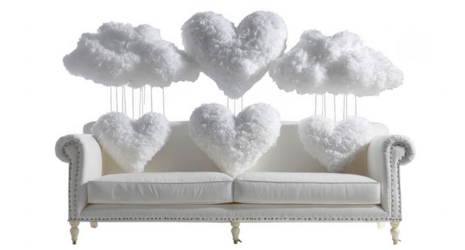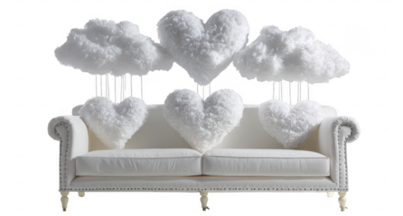 White sofa with fluffy heart and cloud pillows