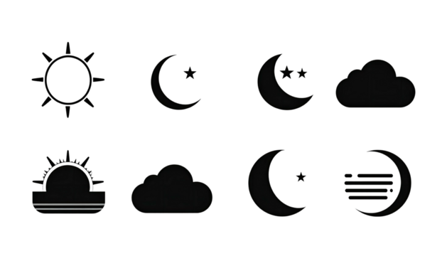 Weather icons displayed on a black background, representing sun, moon phases, and clouds
