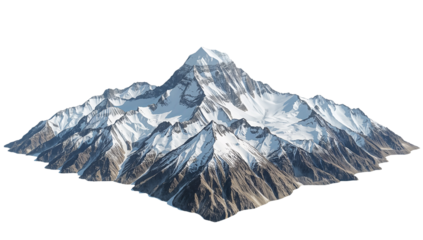 Isolated majestic snowy mountain range peak against a transparent setting for design flexibility,