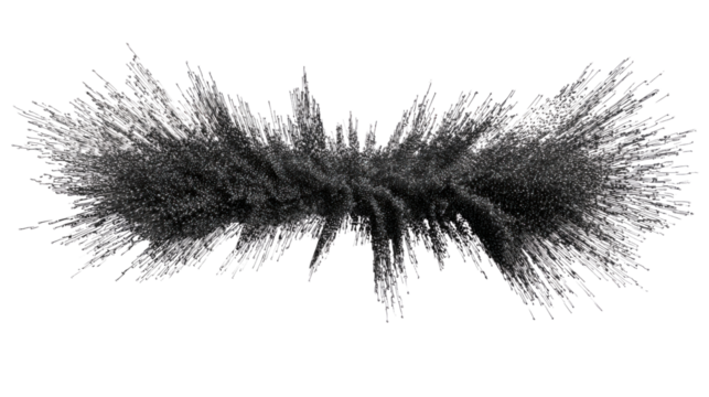 Black powder explosion effect with particles dispersing and scattering, ink dust cloud burst on transparent background