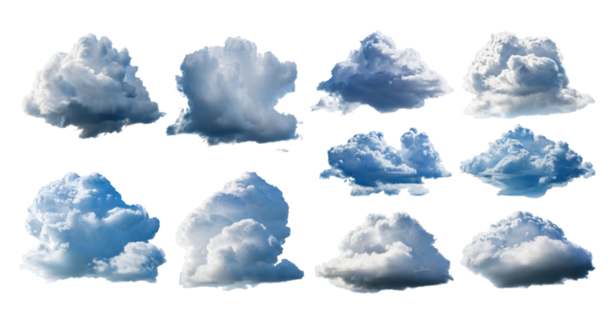Collection of Various Cloud Shapes and Textures in Blue Sky, isolated on transparent background