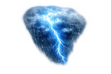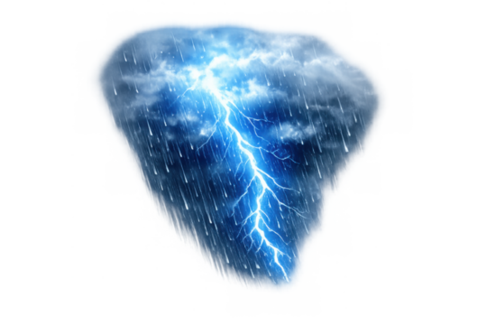 Intense lightning bolt striking down from dark, cloudy skies with heavy rain, symbolizing danger, power, and severe weather, transparent background