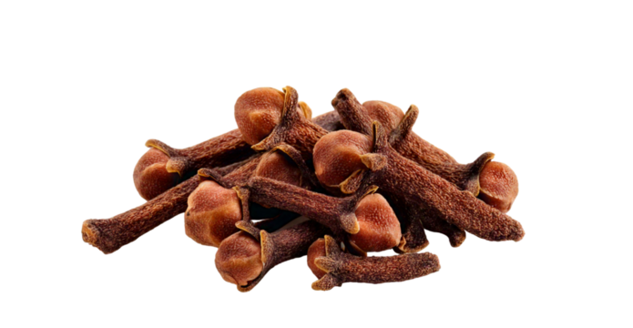heap of dried spice clove aromatic flower bud in cutout transparent background,png format,top view