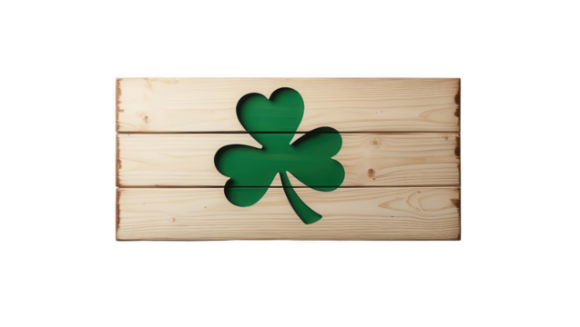 wooden plank sign featuring green shamrock design, symbolizing Irish culture and St. Patrick Day, isolated on transparency background