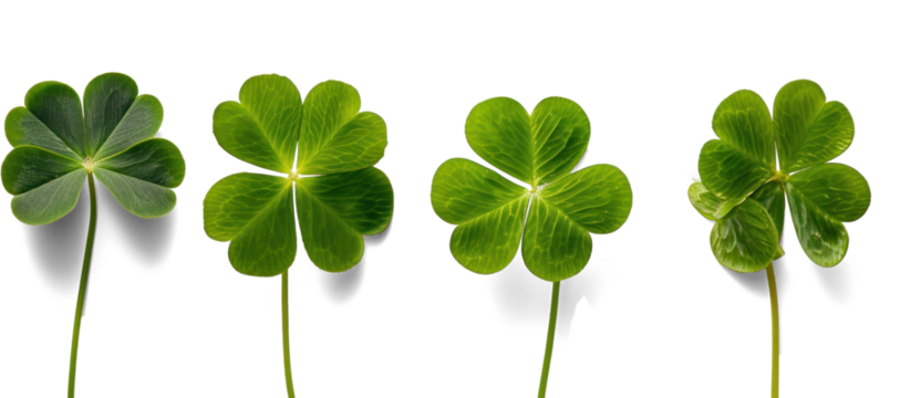 Bright green four-leaf clovers arranged on a transparent background, vibrant shamrocks conveying luck and spring in a clean flat-lay composition