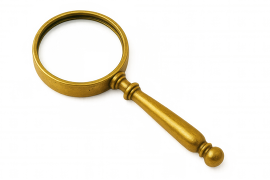 Metallic golden magnifying glass gleaming, highlighting detailed research and discovery elements