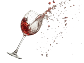 Glass of red wine spills dramatically, creating splash of liquid and droplets in mid air, evoking sense of excitement and movement
