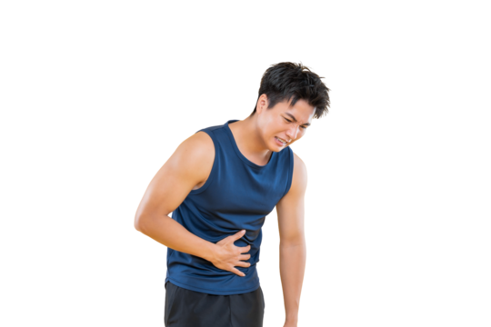 A man expressing abdominal pain, clutching his stomach, wears a tank top, showcasing discomfort, pain on png background