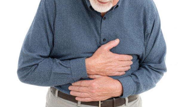 Abdominal Pain: A man clutches his abdomen, expressing discomfort in his stomach area, highlighting a common health issue and emphasizing the need for care.
